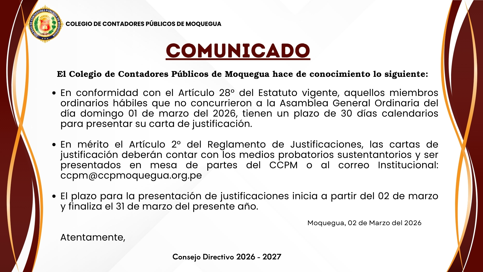 El Colegio de Contadores Públicos de Moquegua recuerda a los agremiados habilitados para participar en la Asamblea General Ordinaria del 01 de marzo de 2026 y que no asistieron, que tienen plazo para presentar su carta de justificación hasta el 31 de marzo del presente año.