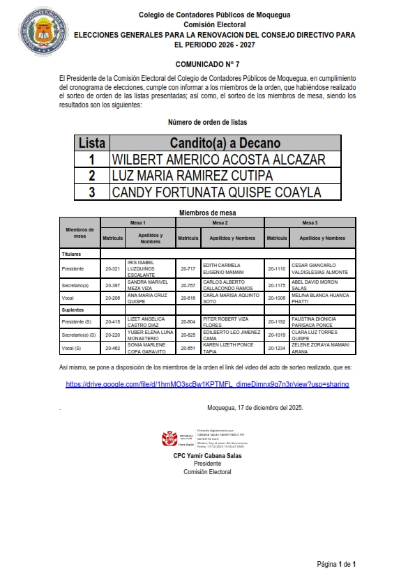 La Comisión Electoral informa con responsabilidad y transparencia que se ha cumplido con el sorteo oficial del orden de listas y la designación de miembros de mesa para las Elecciones Generales del periodo 2026–2027.