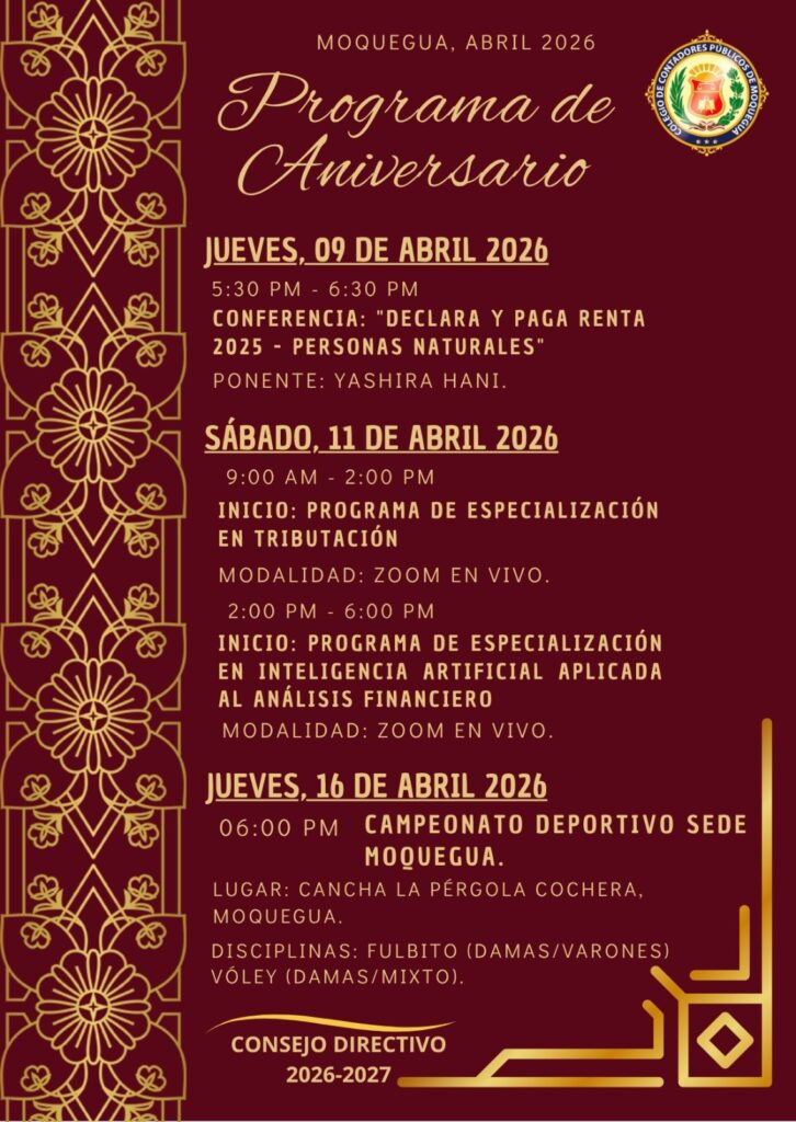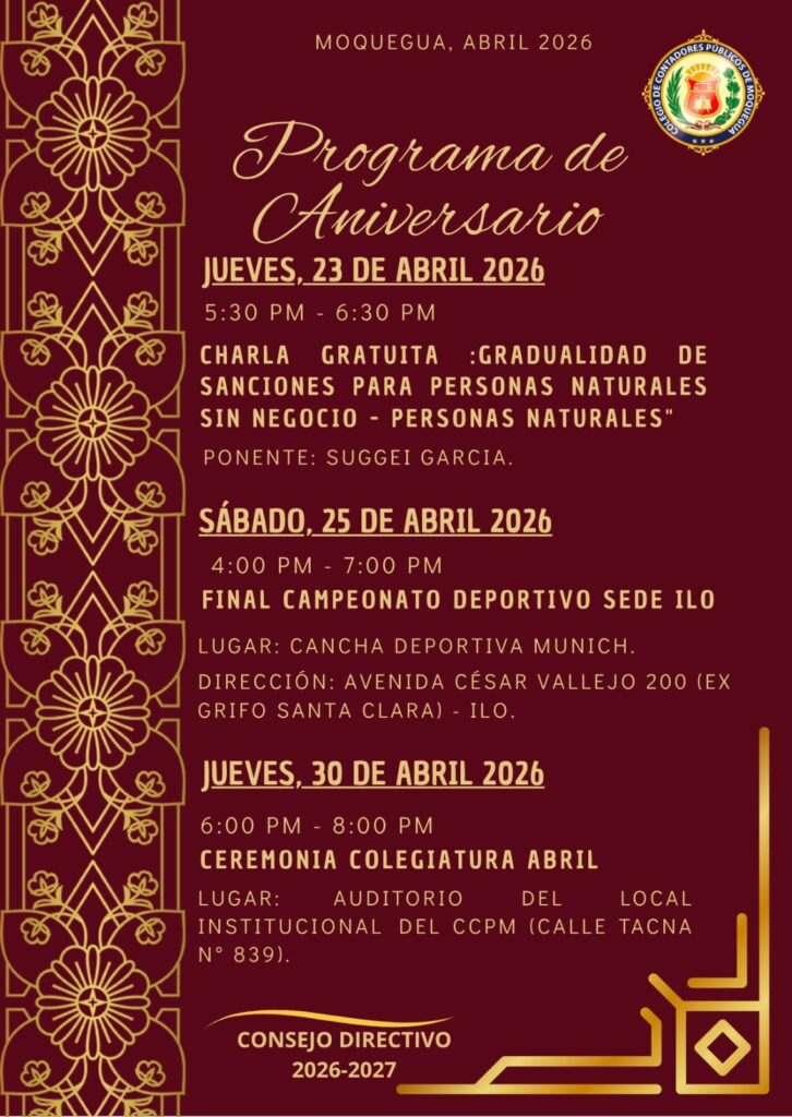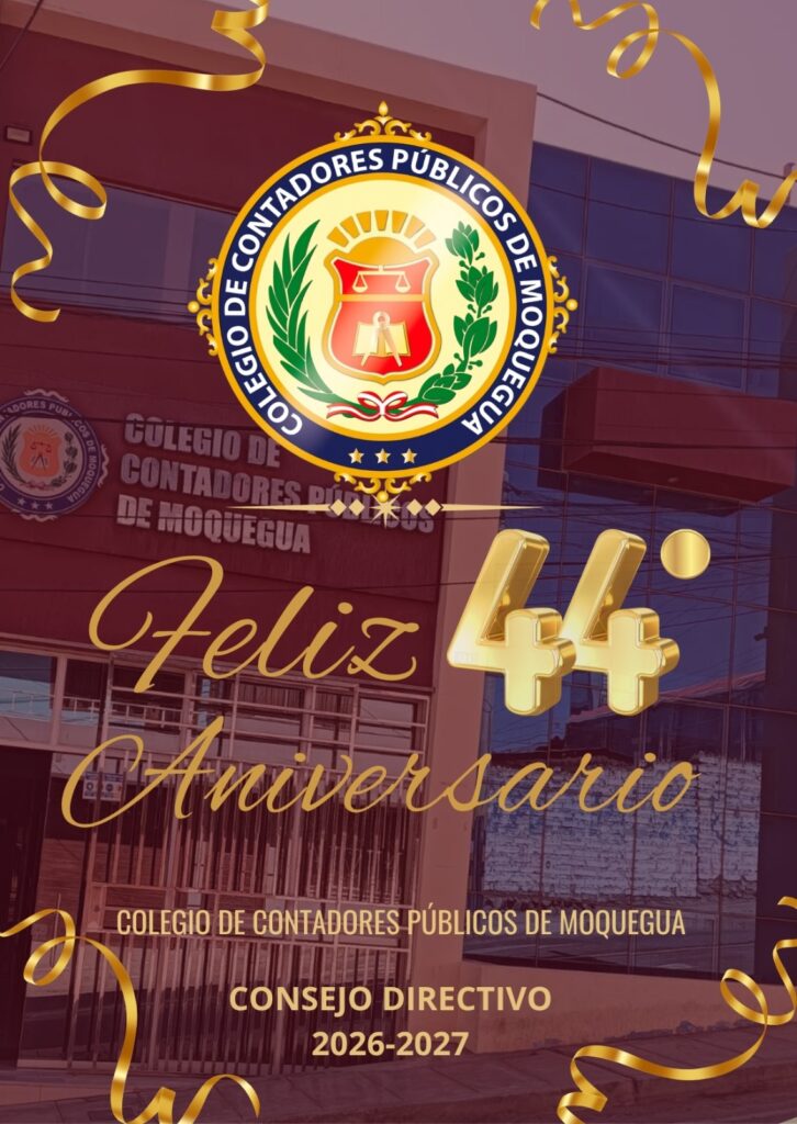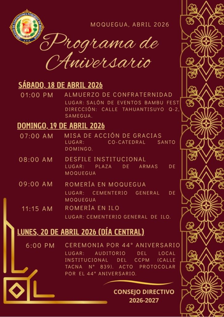 El Colegio de Contadores Públicos de Moquegua tiene el agrado de presentar el Programa Oficial de Actividades con motivo de su 44° Aniversario Institucional.